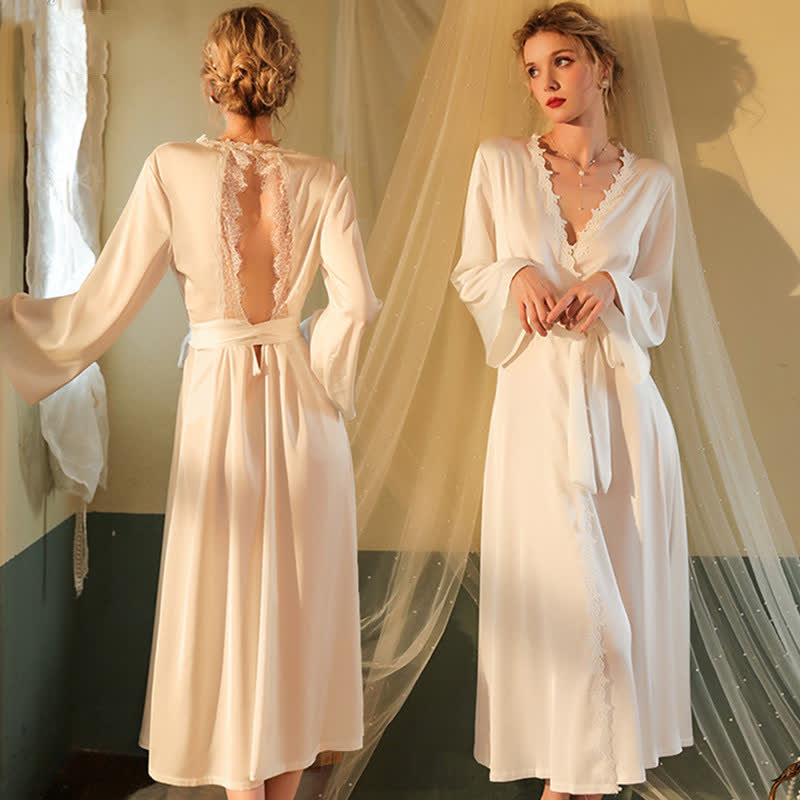 Lace Deep V-neck Backless Kimono Satin Robes