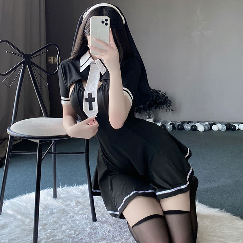 Nun Cross Hollow Out Lingerie Dress Set