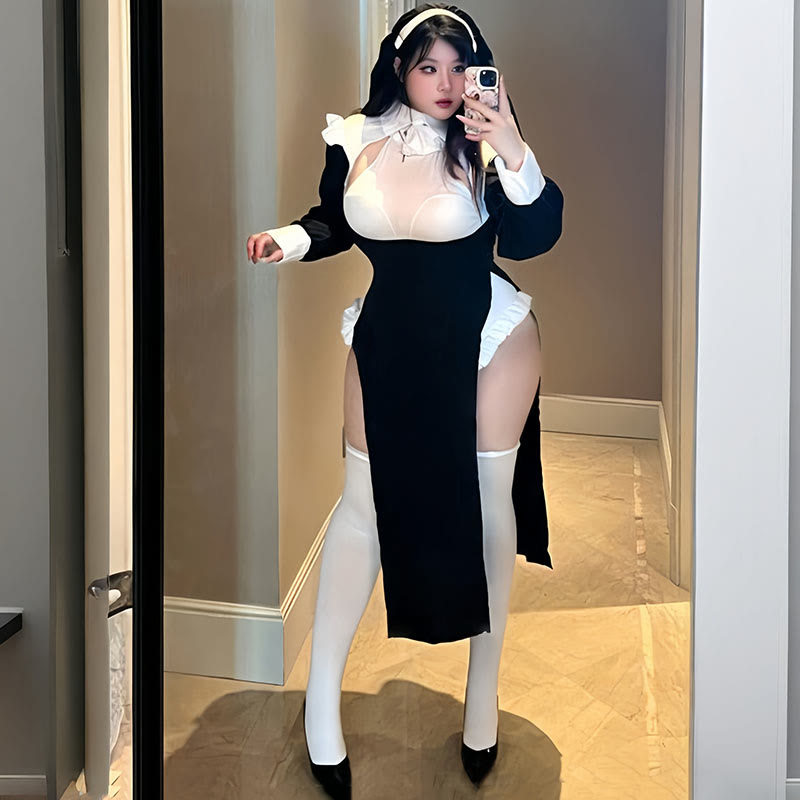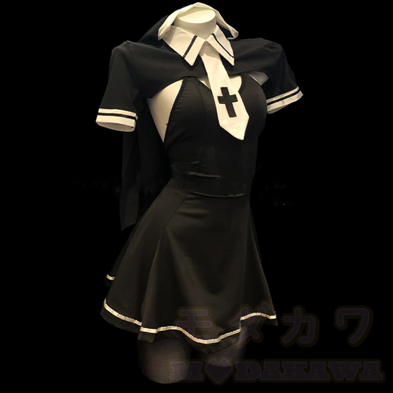 Nun Hollow Out Cross Slit Lingerie Dress Set