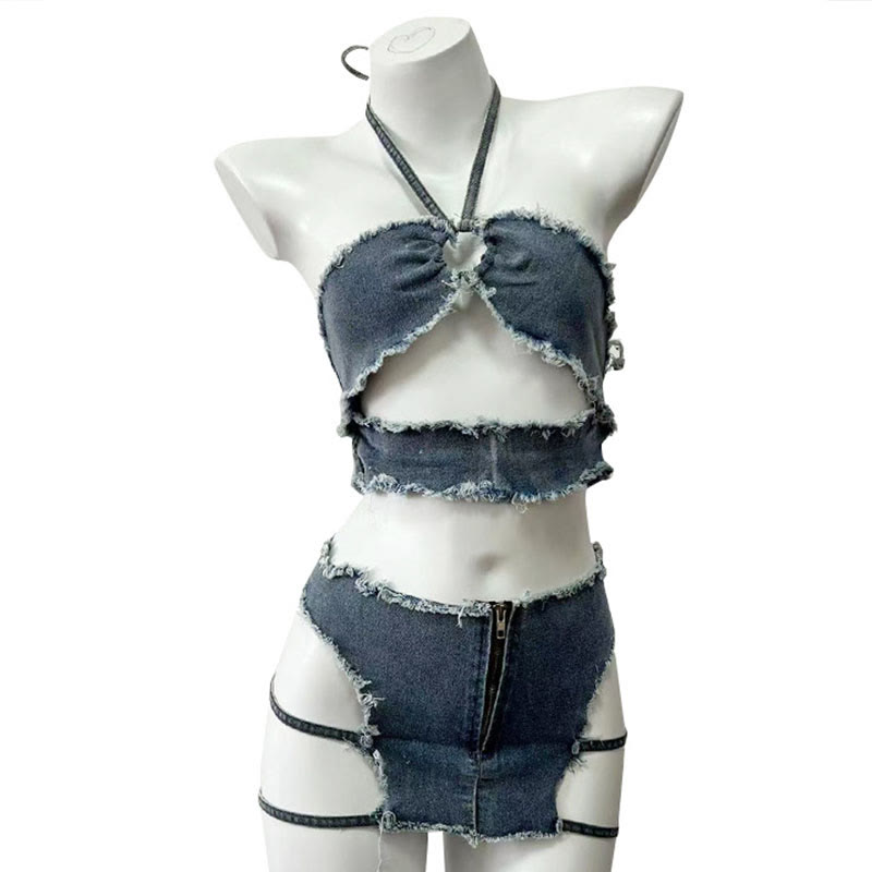 Sexy Halter Hollow Out Love Heart Denim Lingerie Set