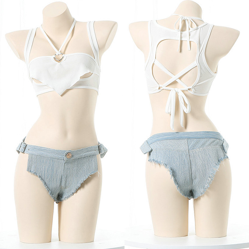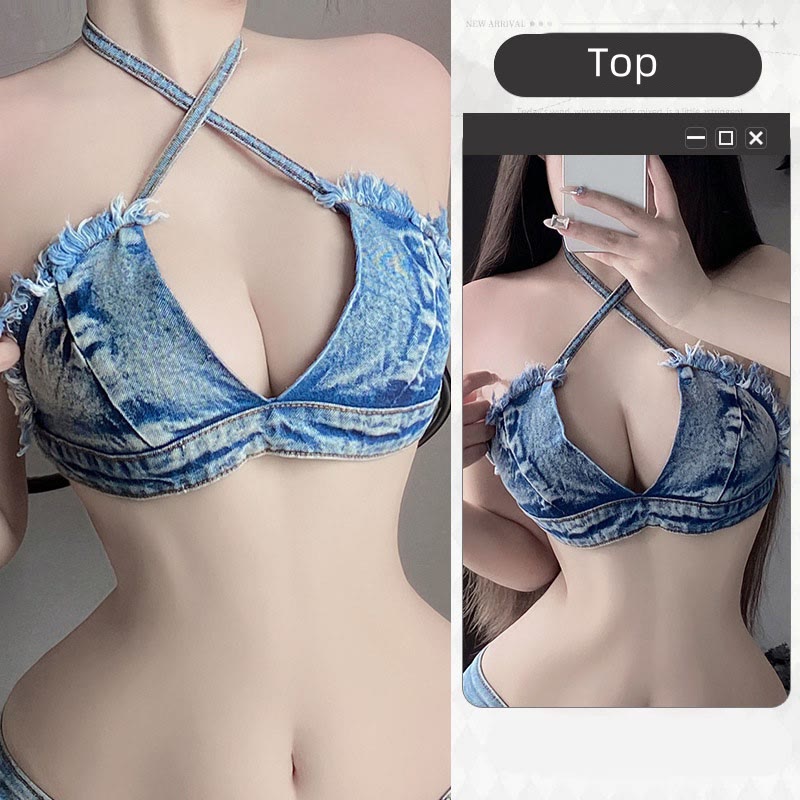 Sexy Denim Bikini Top Hollow Out Shorts Lingerie Two Pieces