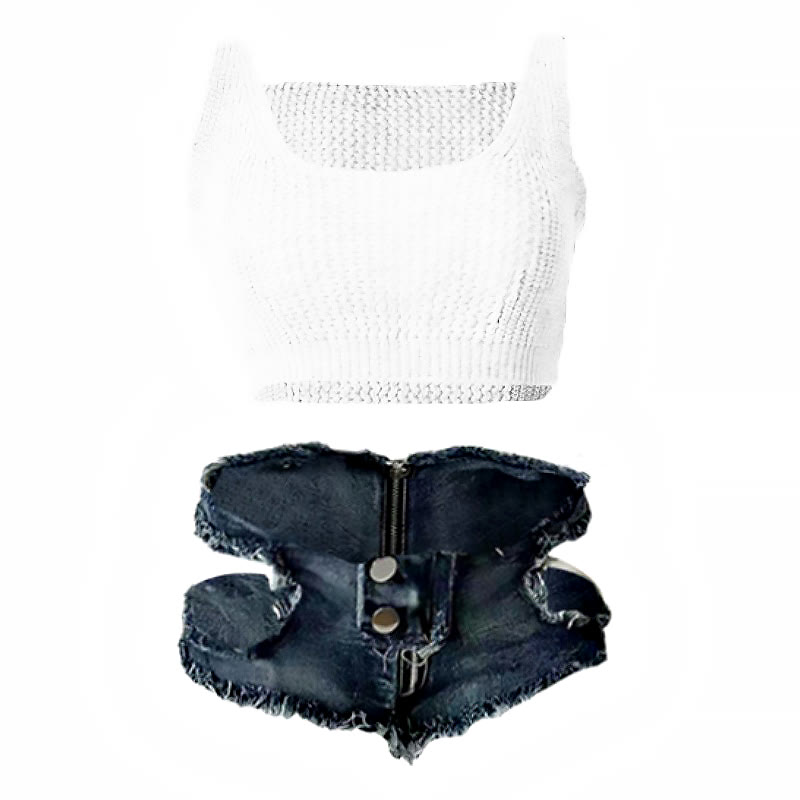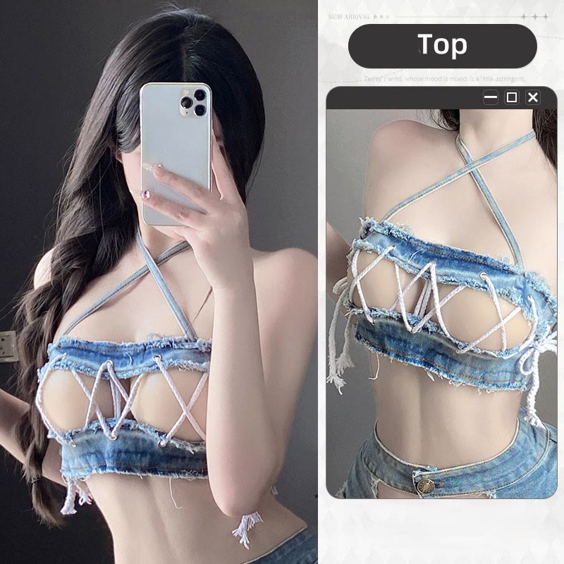 Sexy Denim Hollow Out Top Shorts Lingerie Two Piece