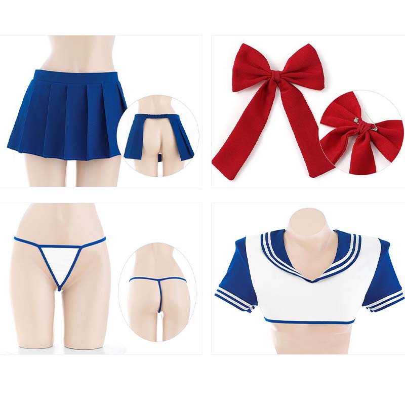Package Includes: Top × 1, Skrit × 1, Bow Knot × 1, G-string × 1, Stockings × 1