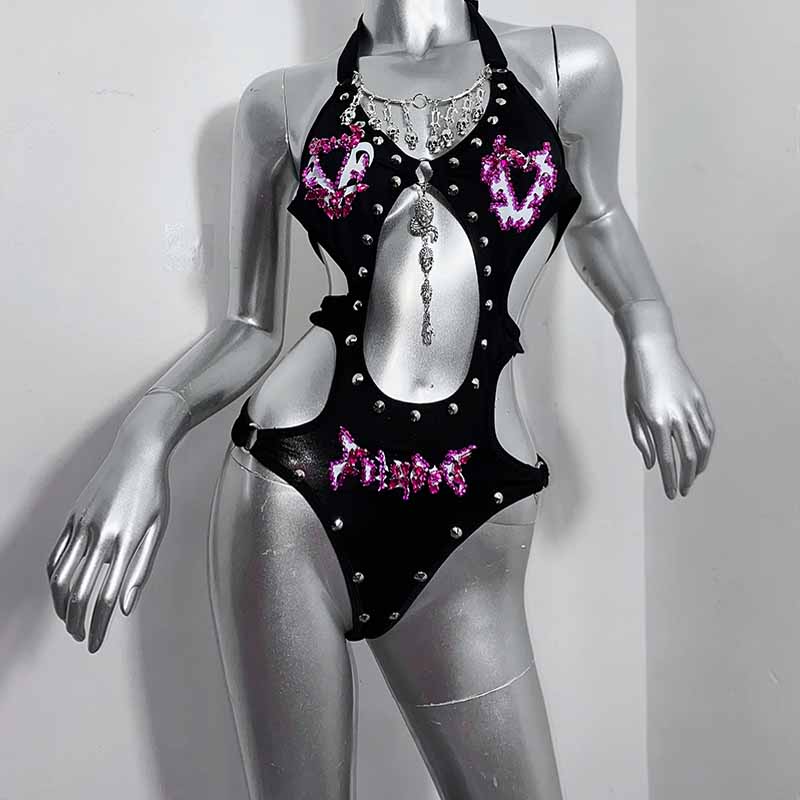 Gothic Skull Hollow Out Rhinestone Bodysuit Drawstring PU Skirt Set