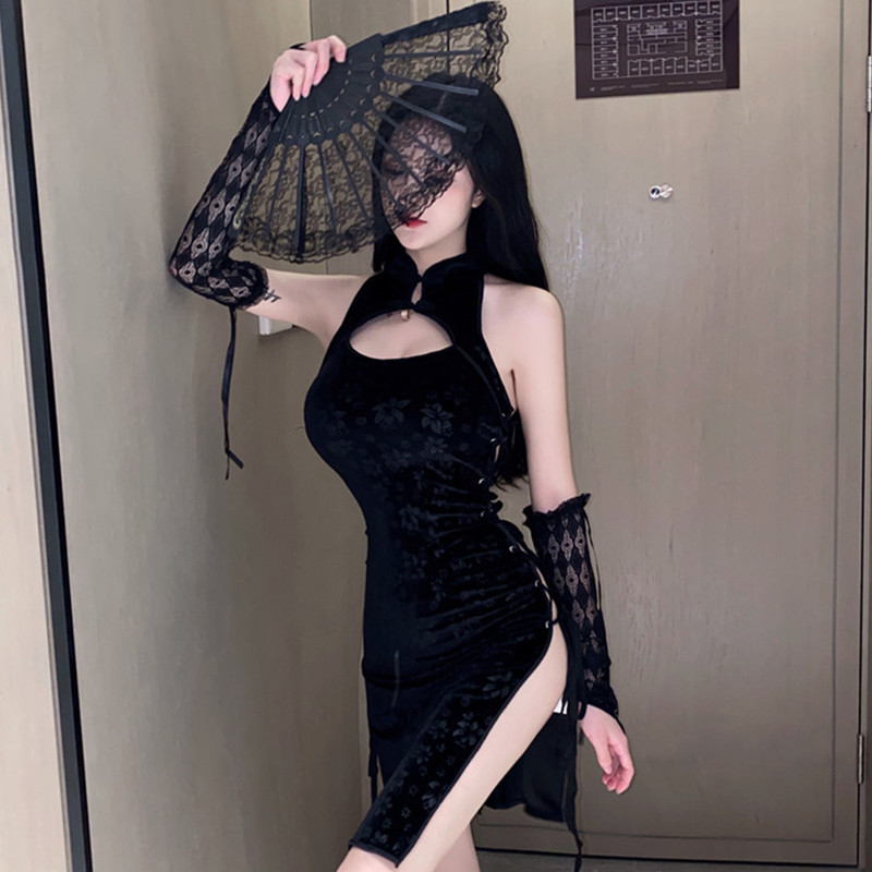 Vintage Lace-up Hollow Out Velvet Lingerie Cheongsam Dress