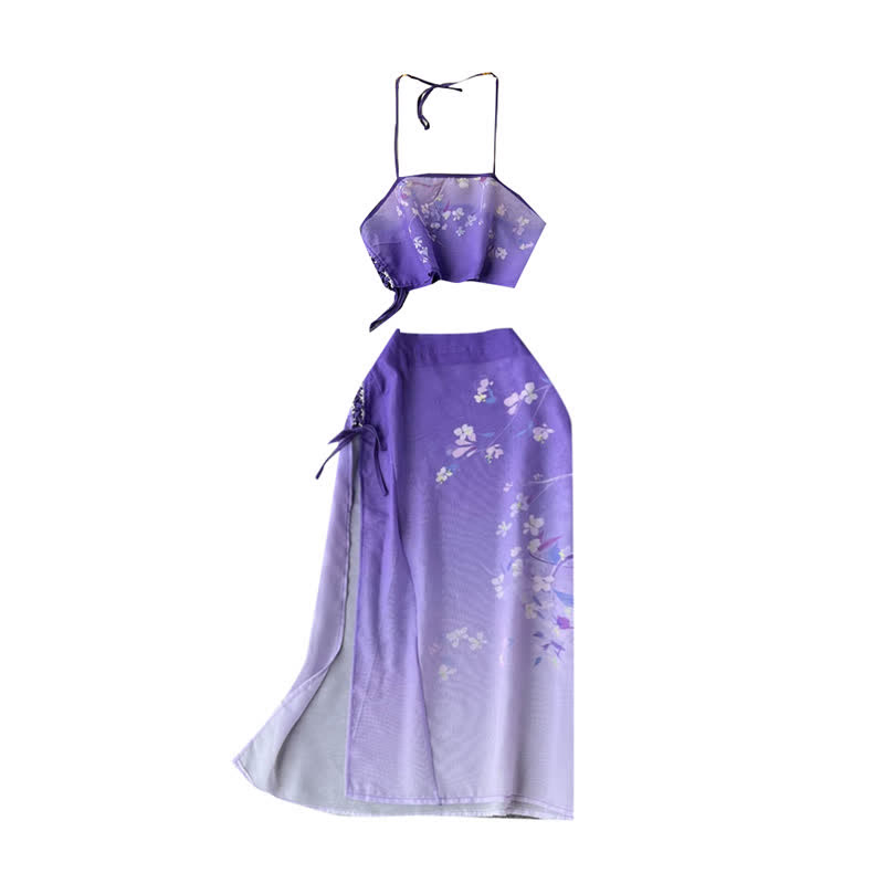 Vintage Hanfu Floral Print Lace Up Split Lingerie Set