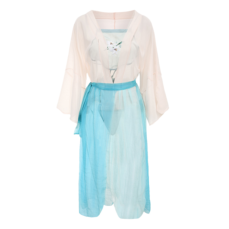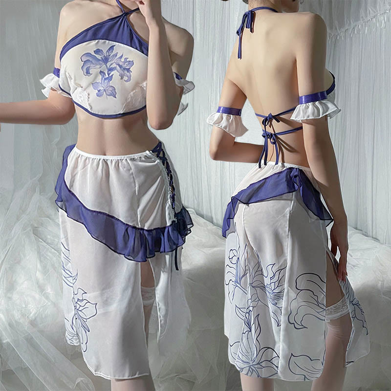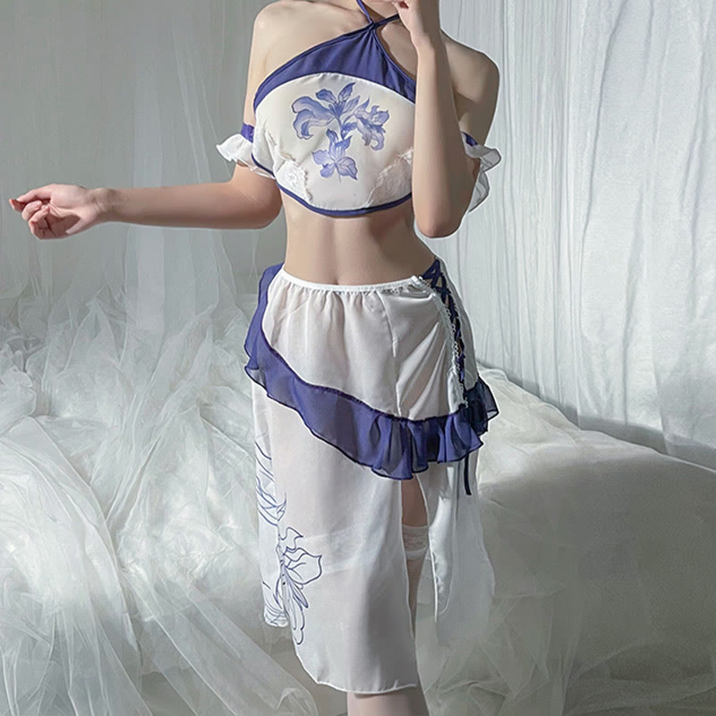 Vintage Hanfu Blossom Embroidery Bibs Split Skirt See Through Lingerie Set