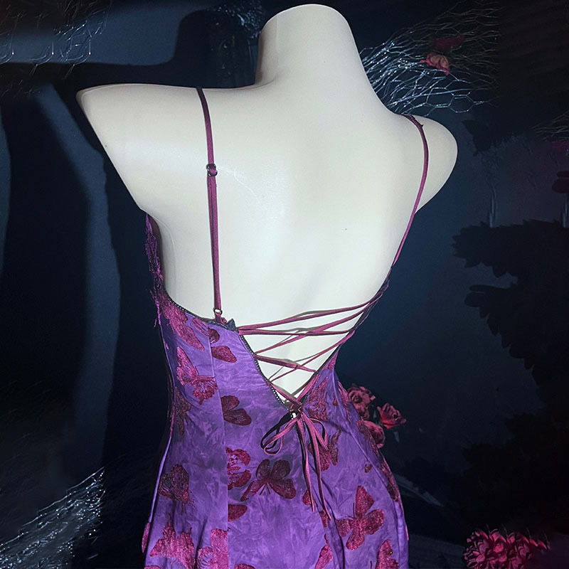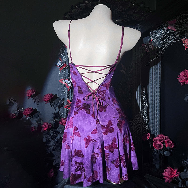 Butterfly Print Hollow Out Lace-up Lingerie Slip Dress