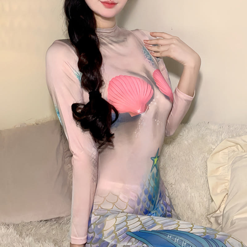 Cosplay Mermaid Seashell Print Zipper Open Crotch Jumpsuit Lingerie