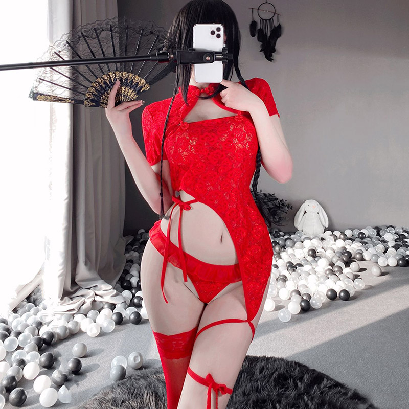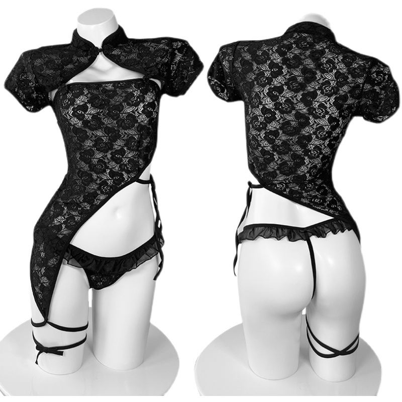 Vintage Hollow Out Lace Up Cheongsam Dress Lingerie Stockings Set
