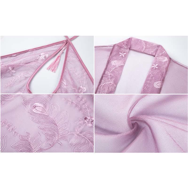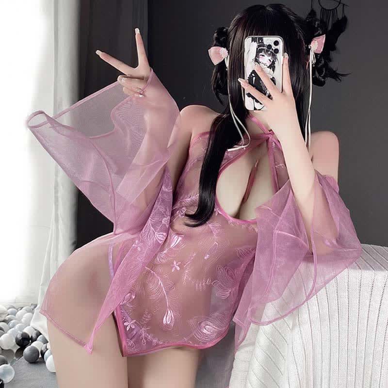 Feather Print Hollow Out See Through Cheongsam Lingerie Cardigan Set