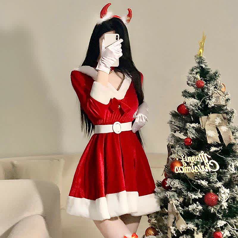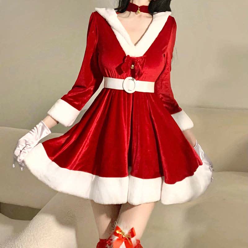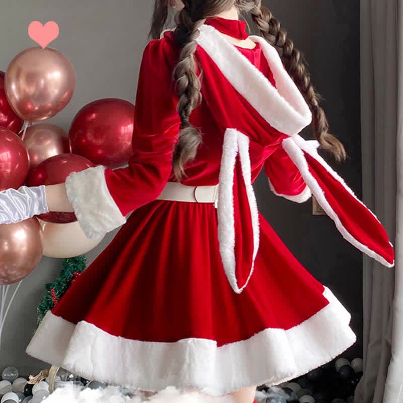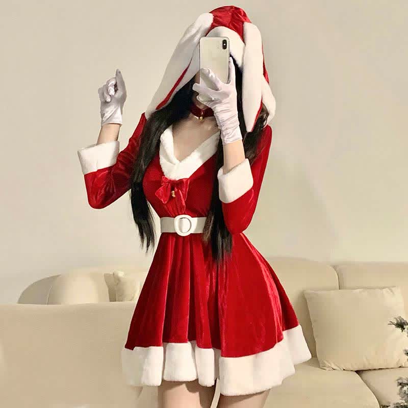 Bunny Ears Bow Knot V-neck Hooded Dress With Belt