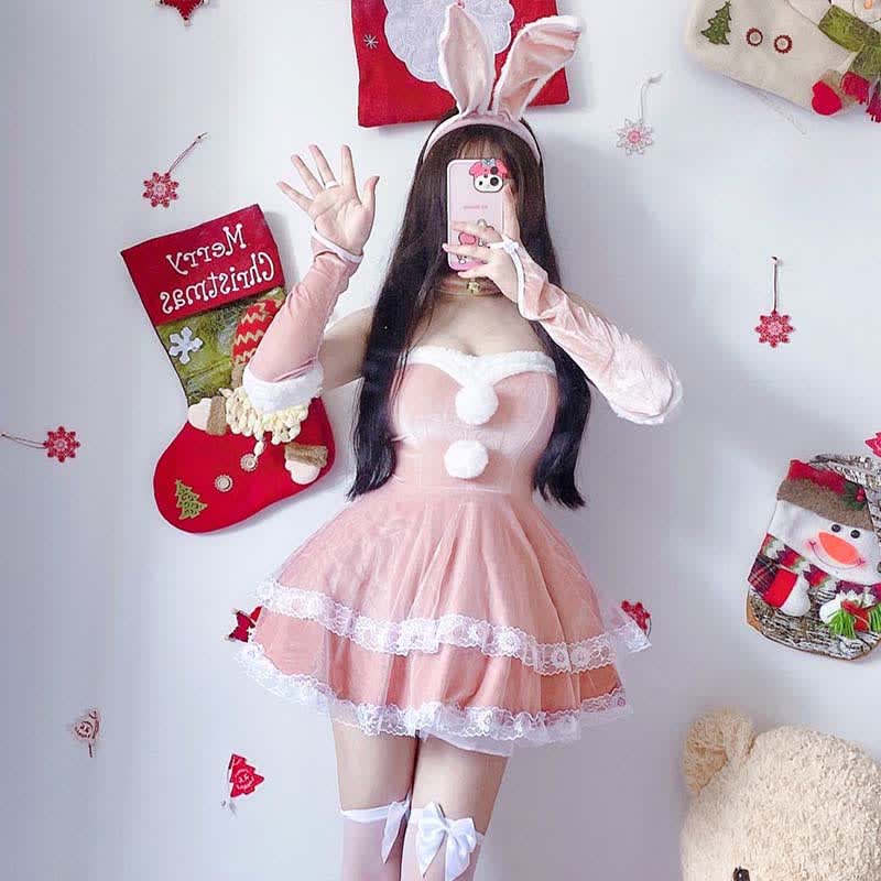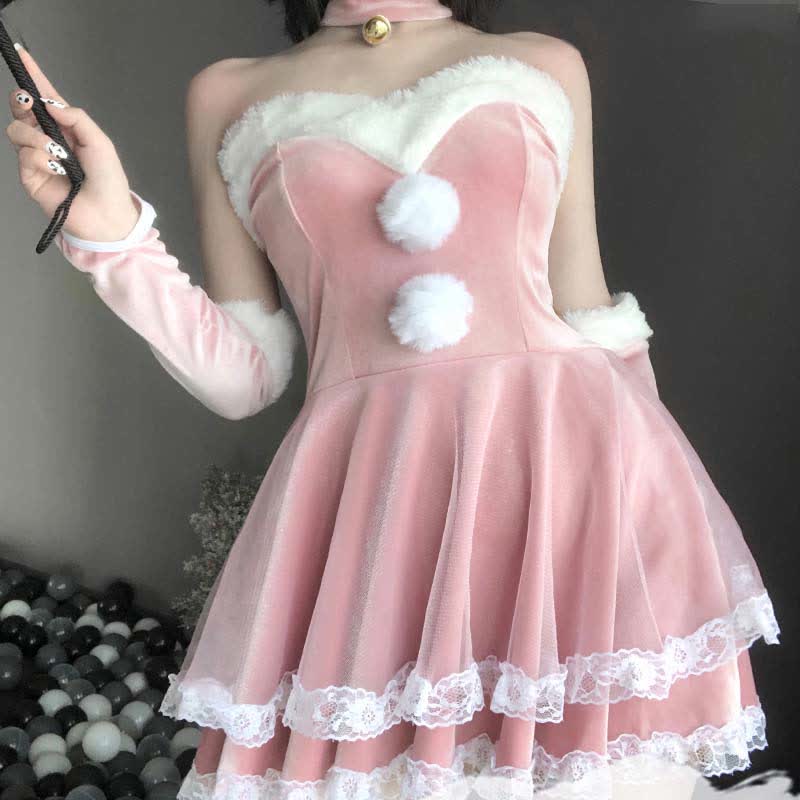 Christmas Cosplay Double Lace Fuzzy Ball Off The Shoulder Dress