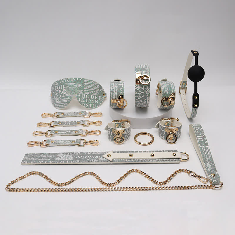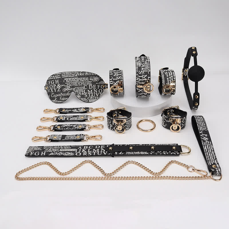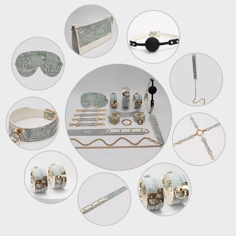 • Package Includes(9 Pieces Set ): Storage Bag, Eyepatch, Snout Ball, Collar, Towing Rope, Handcuffs, Foot Cuffs, Whip, Cross Buckle