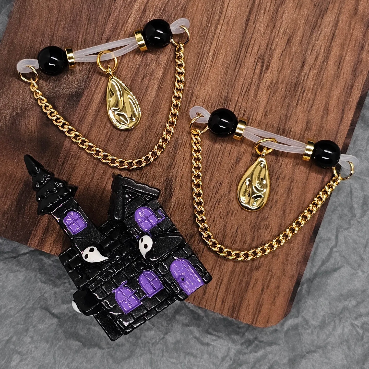 This barbell-style adjustable nipple clip captures the allure of black and gold elegance. The deep black beads contrast beautifully with the shimmering gold teardrop pendant, creating a refined balance of strength and sophistication. A delicate gold chain adds texture and shine, enhancing its luxurious appeal. The adjustable fit ensures comfort and ease, while the timeless design exudes confidence and allure — a statement piece that commands attention.