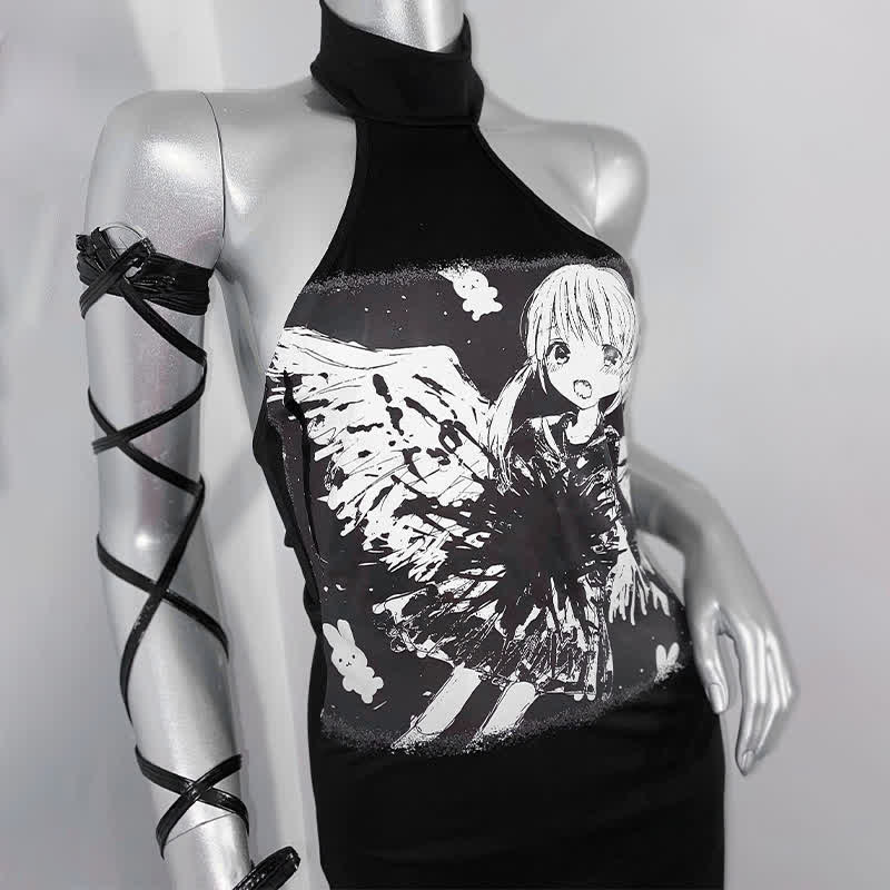 Irregular Halter Anime Print Lace Up Split Dress