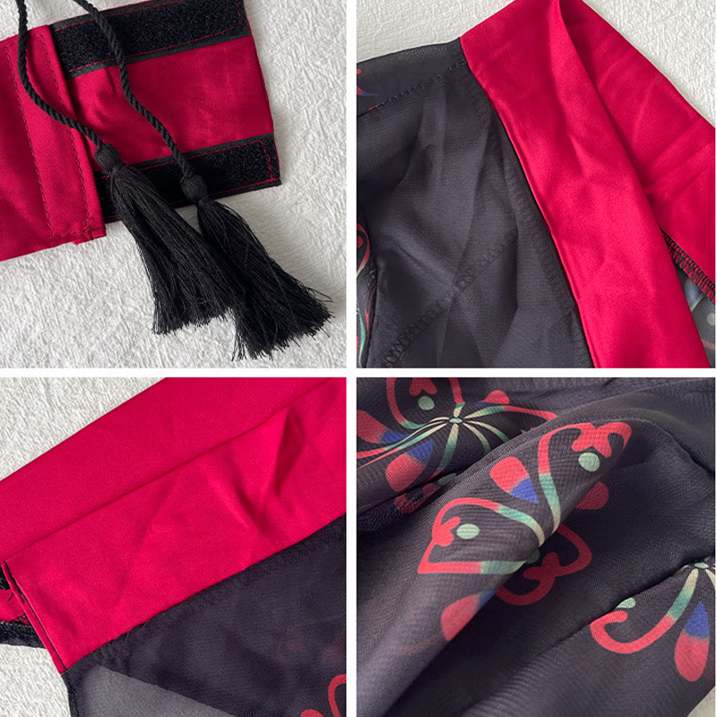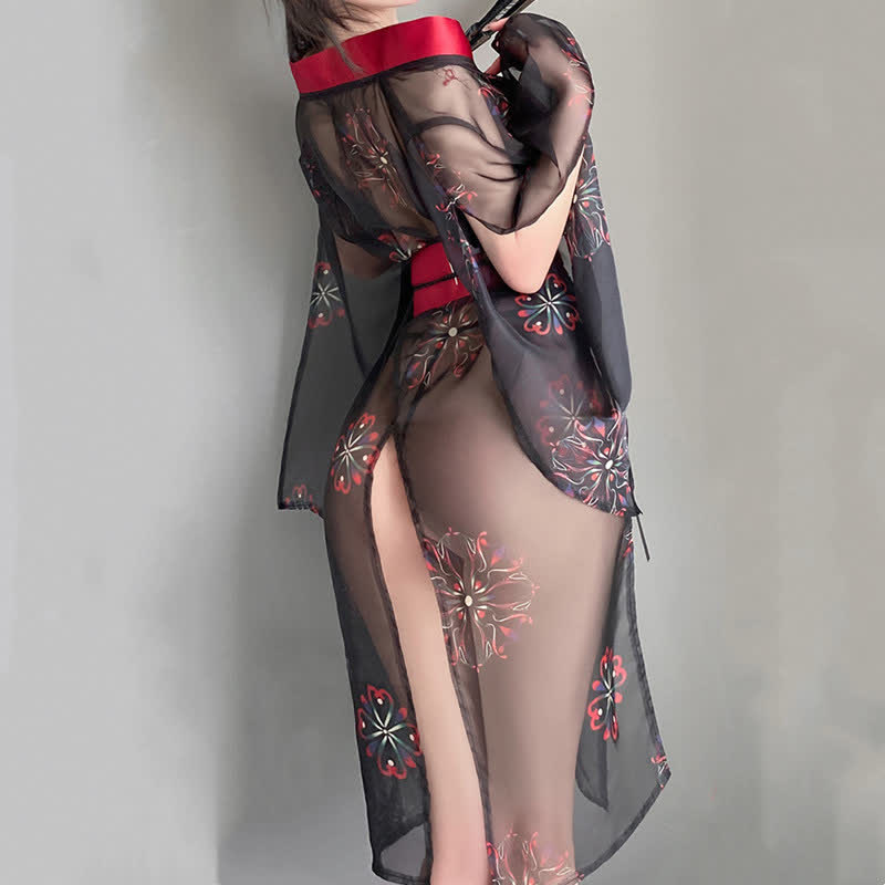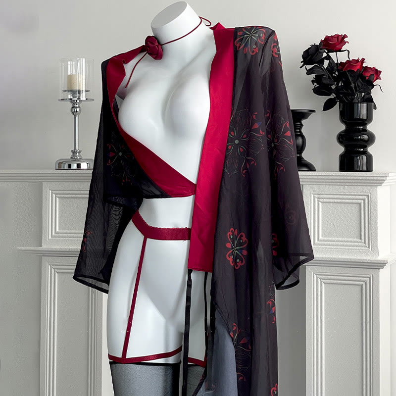 Vintage Print See Through Sexy Kimono Lingerie Set
