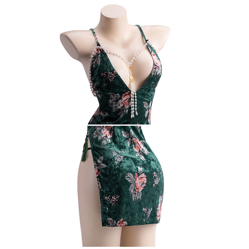 Vintage Sexy Beaded Deep V Floral Print Slit Cheongsam Lingerie